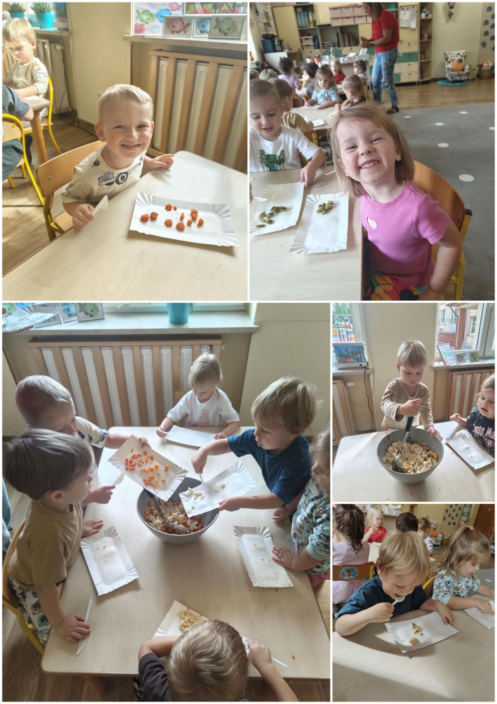Grupa Rybki w ramach omawianego tygodnia związanego z warzywami przygotowała przepyszną sałatkę jarzynową. Dzieci samodzielnie kroiły, mieszały i doprawiały sałatkę. Na koniec urządziliśmy sobie wielką ucztę.