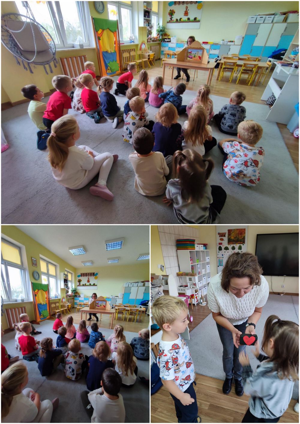 Grupę odwiedziła Pani Anna Simczuk z Biblioteki Pedagogicznej w Sochaczewie i przeczytała z wykorzystaniem teatrzyku Kamishibai bajkę pt: „Mądra kurka” - o wartościach wspólnej pracy.