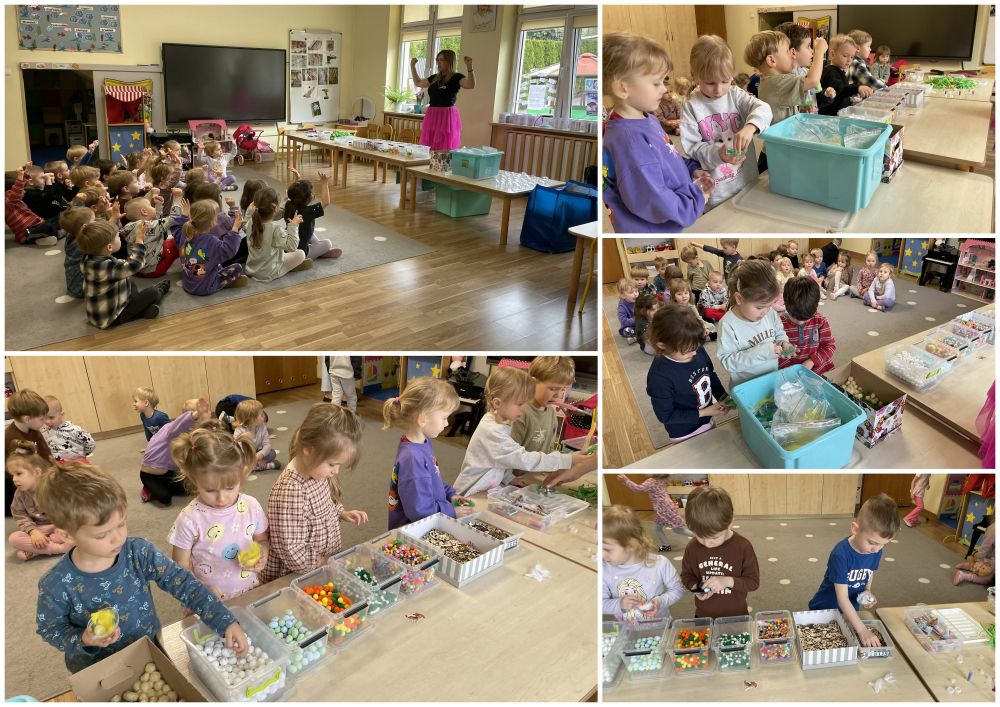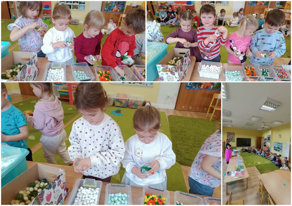 Przedszkolaki wykorzystały akrylowe jajka i kolorowe elementy wypełniające wnętrze.